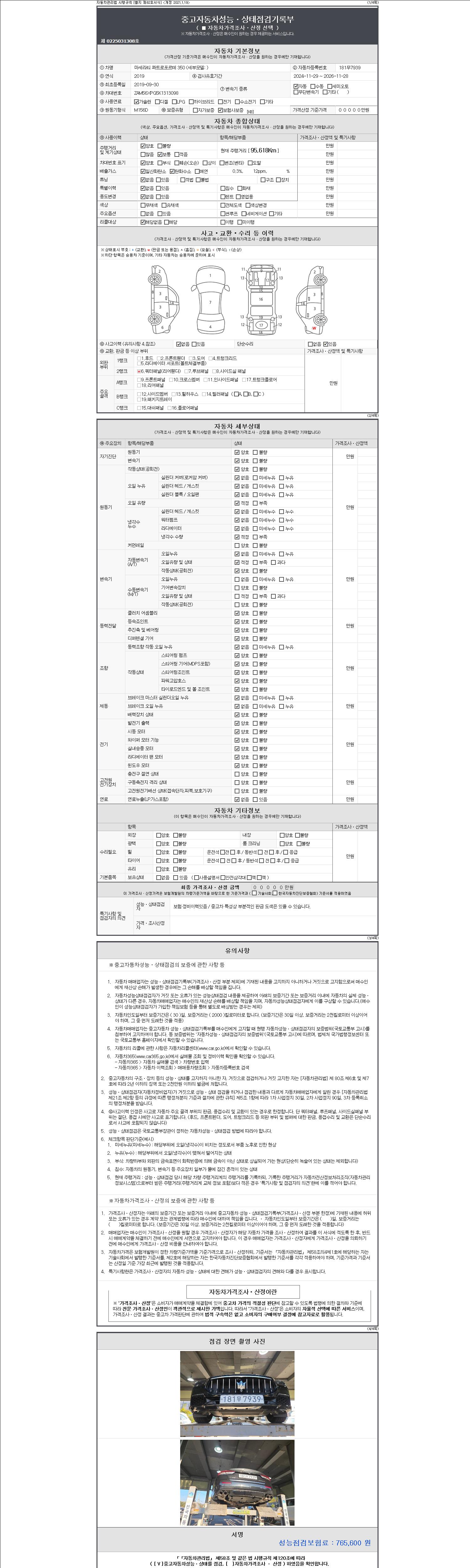 자동차관리법 시행규칙 제120조의 규정에 따라 별지 제 82호서식 《중고자동차 성능, 상태점검 기록부》를 발행한 성능, 상태점검자 및 매매자는 아래의 보증기간 또는 보증거리 이내의 중고자동차, 성능점검 기록부에 기재된 내용과 자동차의 실제 성능, 상태가 다른 경우 계약 또는 관계법령에 따라 매수인에 대하여 책임을 집니다.