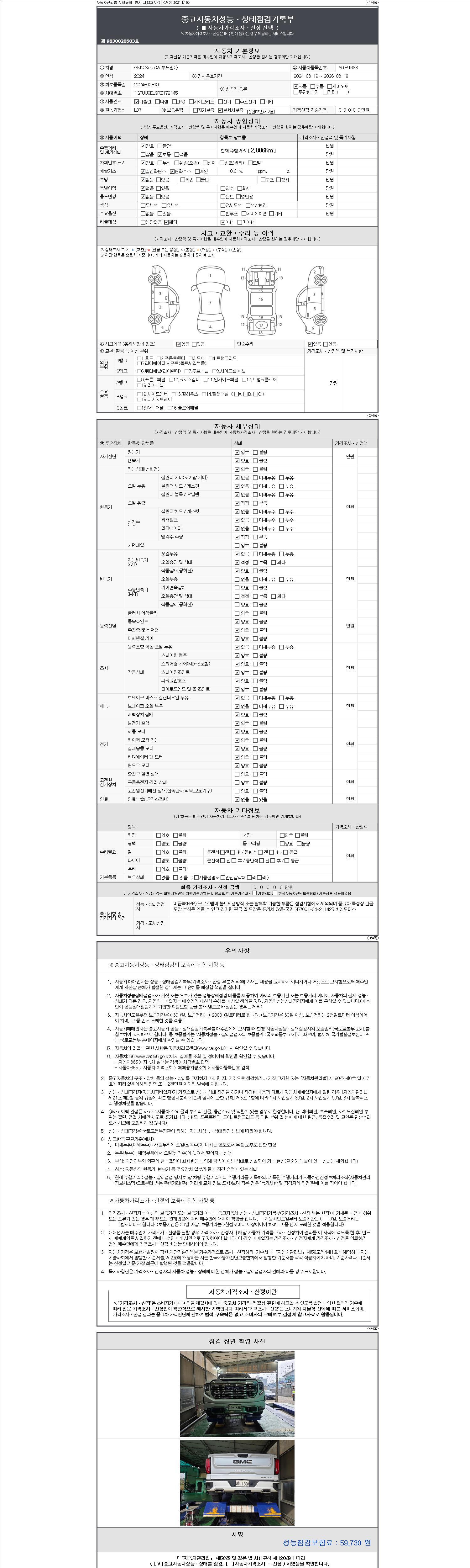 자동차관리법 시행규칙 제120조의 규정에 따라 별지 제 82호서식 《중고자동차 성능, 상태점검 기록부》를 발행한 성능, 상태점검자 및 매매자는 아래의 보증기간 또는 보증거리 이내의 중고자동차, 성능점검 기록부에 기재된 내용과 자동차의 실제 성능, 상태가 다른 경우 계약 또는 관계법령에 따라 매수인에 대하여 책임을 집니다.