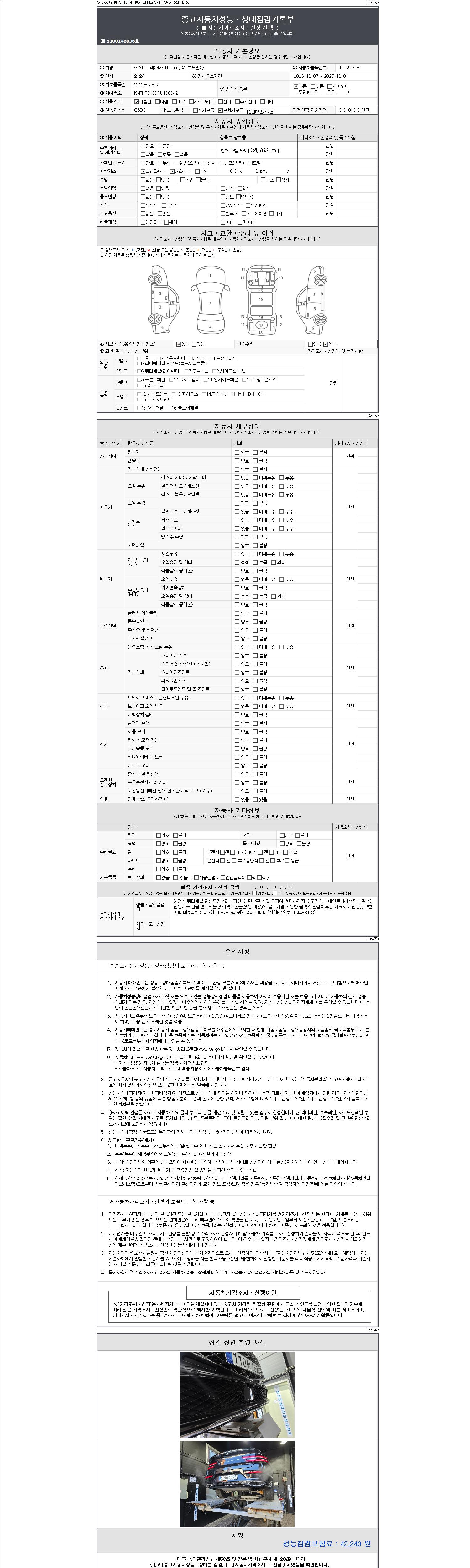 자동차관리법 시행규칙 제120조의 규정에 따라 별지 제 82호서식 《중고자동차 성능, 상태점검 기록부》를 발행한 성능, 상태점검자 및 매매자는 아래의 보증기간 또는 보증거리 이내의 중고자동차, 성능점검 기록부에 기재된 내용과 자동차의 실제 성능, 상태가 다른 경우 계약 또는 관계법령에 따라 매수인에 대하여 책임을 집니다.