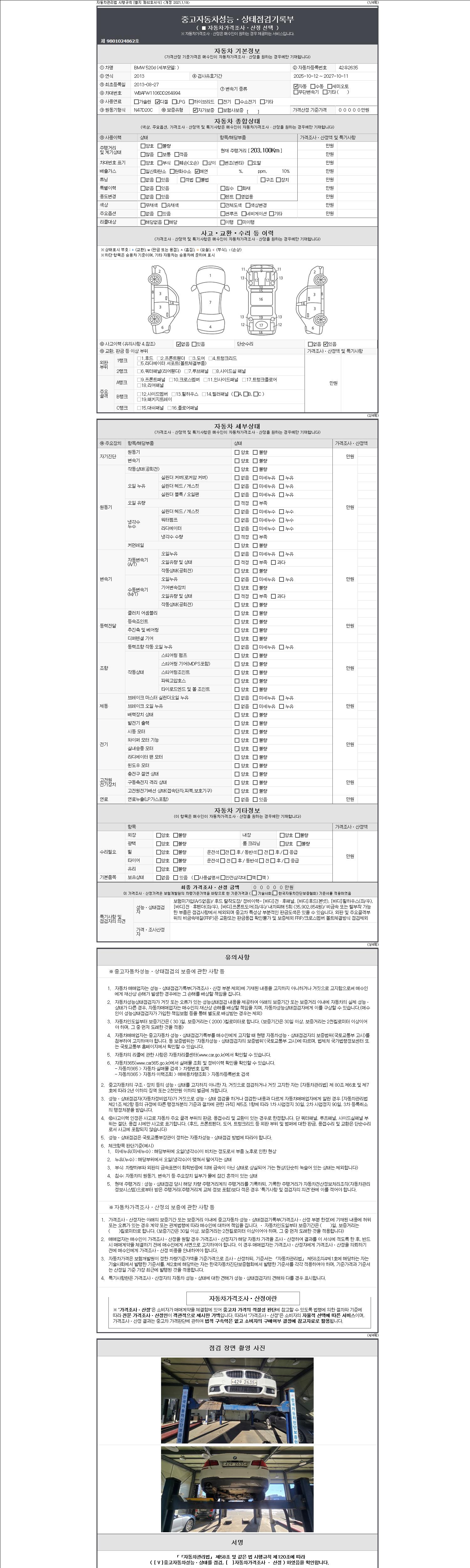 -중고자동차 매매업자를 통해 차량을 구입하실 경우 반드시 "중고자동차 성능, 상태점검 기록부"를 교뷰 받으셔야 하며, 매매업자는 반드시 의무 교부 하여야 압니다.
