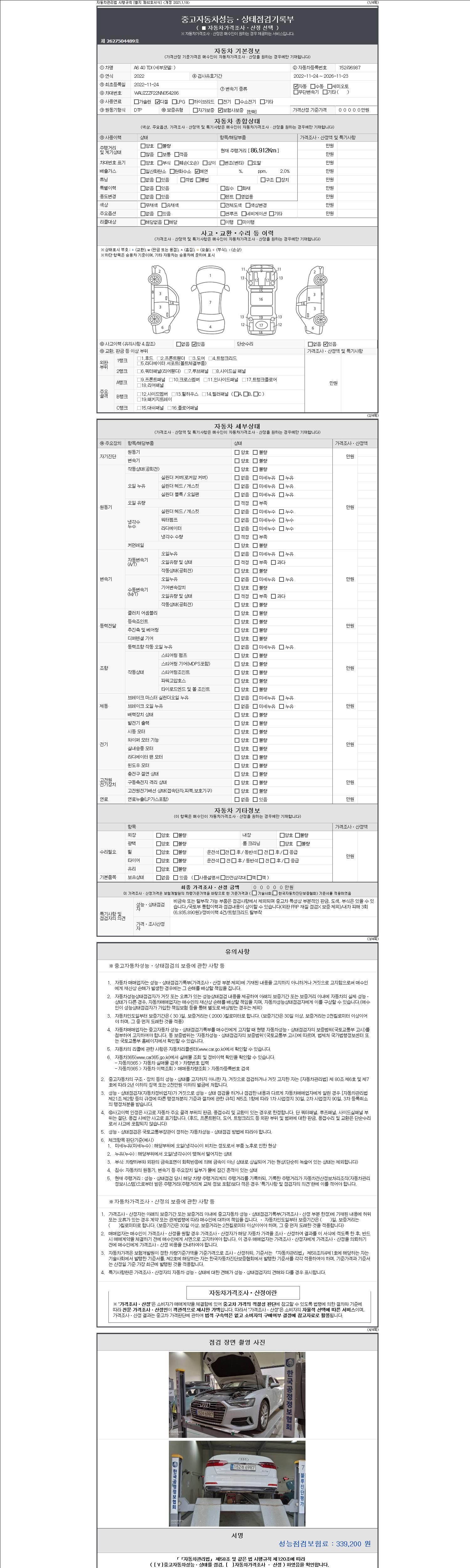 자동차관리법 시행규칙 제120조의 규정에 따라 별지 제 82호서식 《중고자동차 성능, 상태점검 기록부》를 발행한 성능, 상태점검자 및 매매자는 아래의 보증기간 또는 보증거리 이내의 중고자동차, 성능점검 기록부에 기재된 내용과 자동차의 실제 성능, 상태가 다른 경우 계약 또는 관계법령에 따라 매수인에 대하여 책임을 집니다.