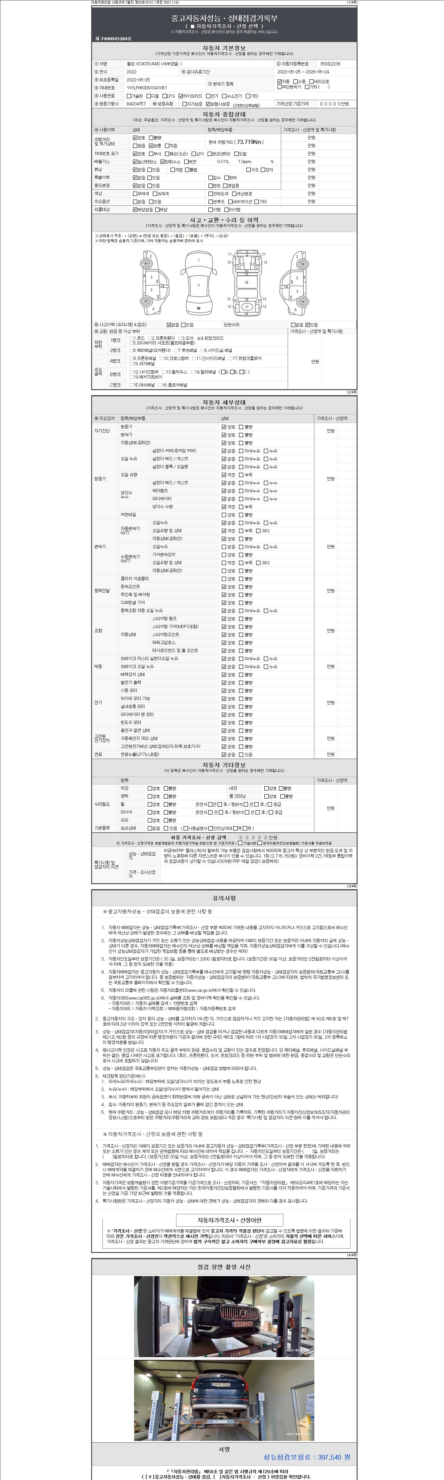 자동차관리법 시행규칙 제120조의 규정에 따라 별지 제 82호서식 《중고자동차 성능, 상태점검 기록부》를 발행한 성능, 상태점검자 및 매매자는 아래의 보증기간 또는 보증거리 이내의 중고자동차, 성능점검 기록부에 기재된 내용과 자동차의 실제 성능, 상태가 다른 경우 계약 또는 관계법령에 따라 매수인에 대하여 책임을 집니다.