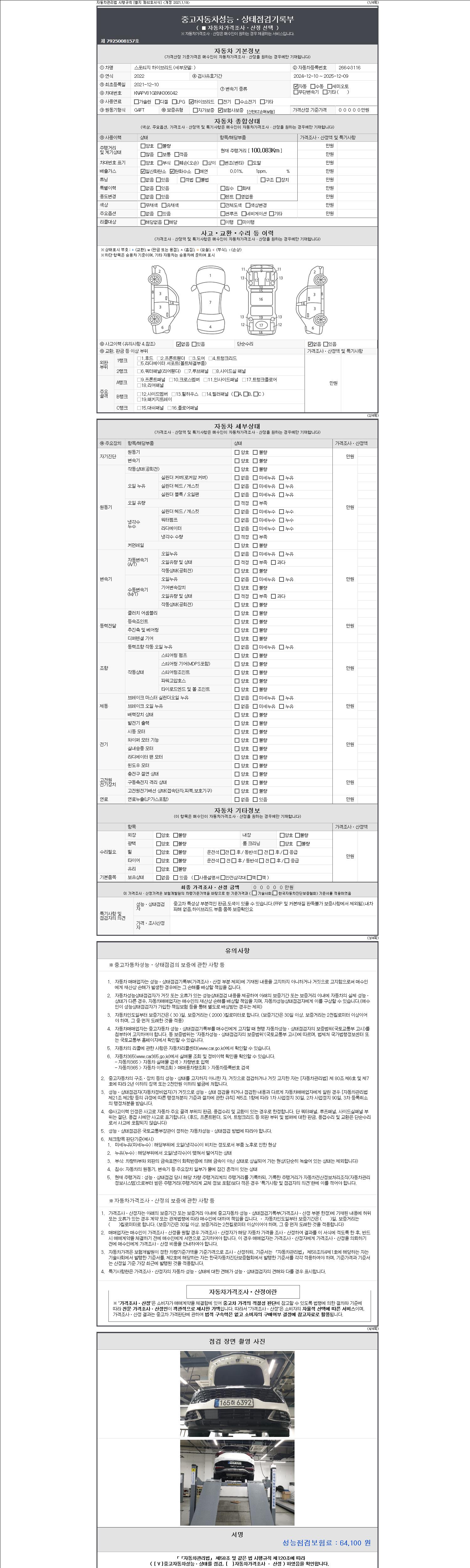 자동차관리법 시행규칙 제120조의 규정에 따라 별지 제 82호서식 《중고자동차 성능, 상태점검 기록부》를 발행한 성능, 상태점검자 및 매매자는 아래의 보증기간 또는 보증거리 이내의 중고자동차, 성능점검 기록부에 기재된 내용과 자동차의 실제 성능, 상태가 다른 경우 계약 또는 관계법령에 따라 매수인에 대하여 책임을 집니다.