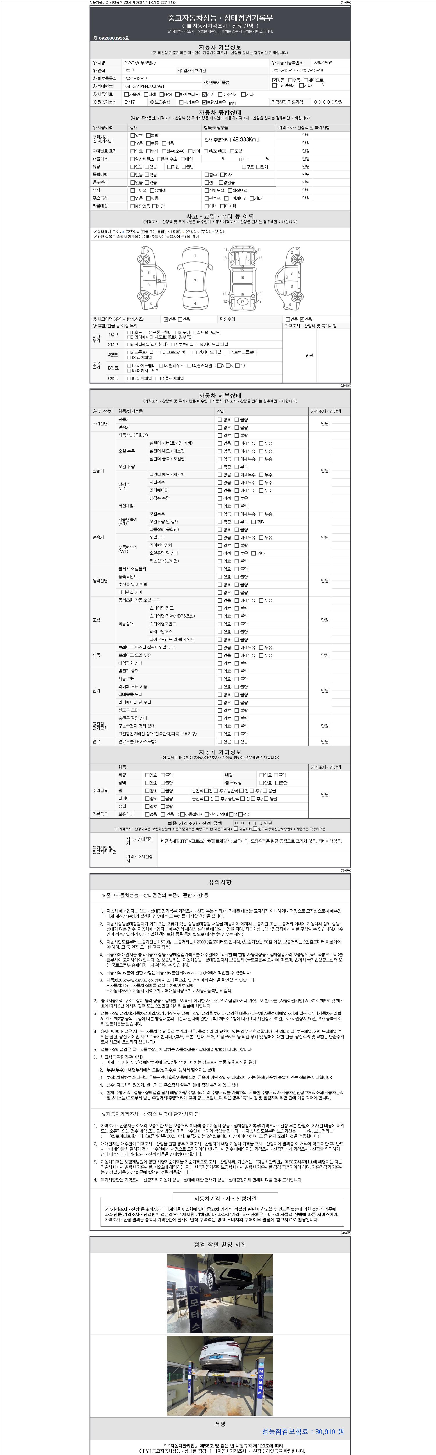 자동차관리법 시행규칙 제120조의 규정에 따라 별지 제 82호서식 《중고자동차 성능, 상태점검 기록부》를 발행한 성능, 상태점검자 및 매매자는 아래의 보증기간 또는 보증거리 이내의 중고자동차, 성능점검 기록부에 기재된 내용과 자동차의 실제 성능, 상태가 다른 경우 계약 또는 관계법령에 따라 매수인에 대하여 책임을 집니다.