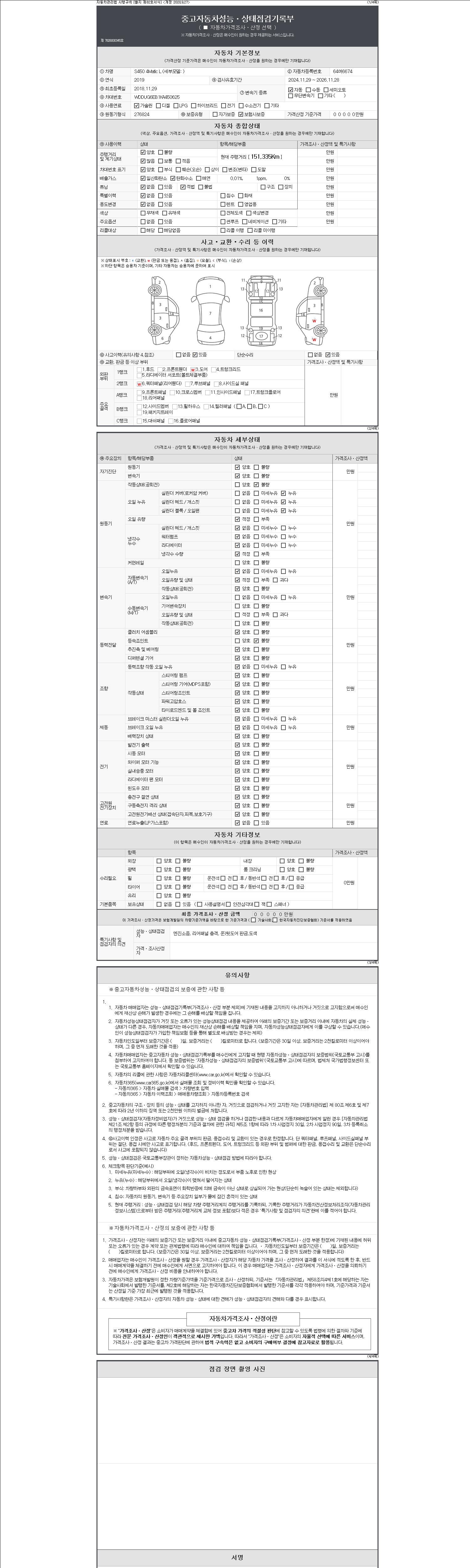 자동차관리법 시행규칙 제120조의 규정에 따라 별지 제 82호서식 《중고자동차 성능, 상태점검 기록부》를 발행한 성능, 상태점검자 및 매매자는 아래의 보증기간 또는 보증거리 이내의 중고자동차, 성능점검 기록부에 기재된 내용과 자동차의 실제 성능, 상태가 다른 경우 계약 또는 관계법령에 따라 매수인에 대하여 책임을 집니다.
