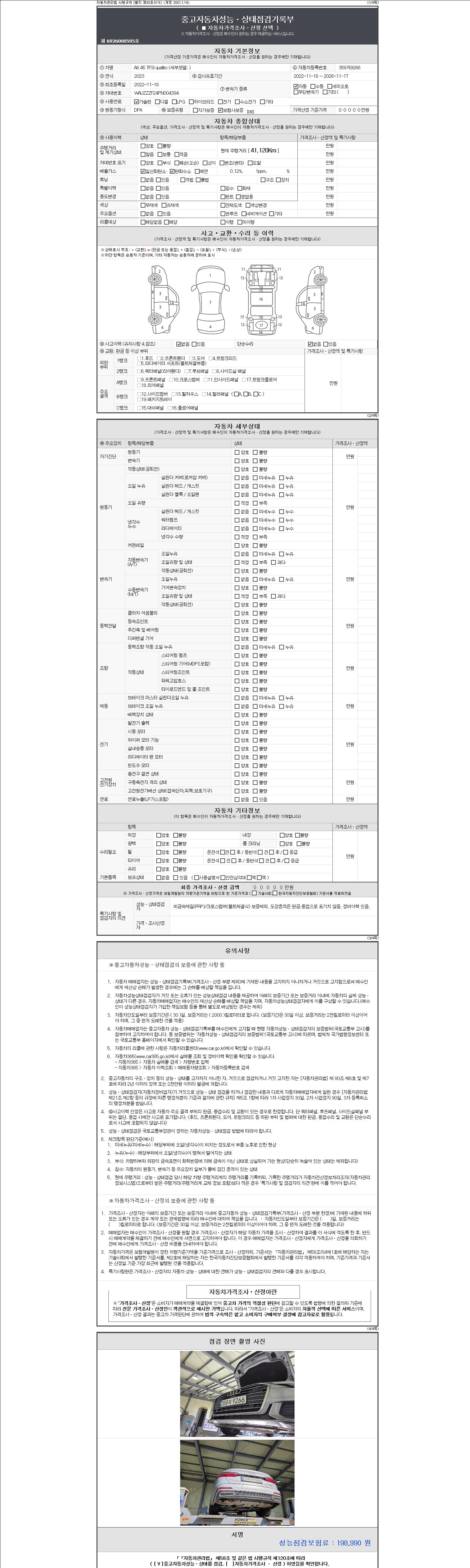 자동차관리법 시행규칙 제120조의 규정에 따라 별지 제 82호서식 《중고자동차 성능, 상태점검 기록부》를 발행한 성능, 상태점검자 및 매매자는 아래의 보증기간 또는 보증거리 이내의 중고자동차, 성능점검 기록부에 기재된 내용과 자동차의 실제 성능, 상태가 다른 경우 계약 또는 관계법령에 따라 매수인에 대하여 책임을 집니다.