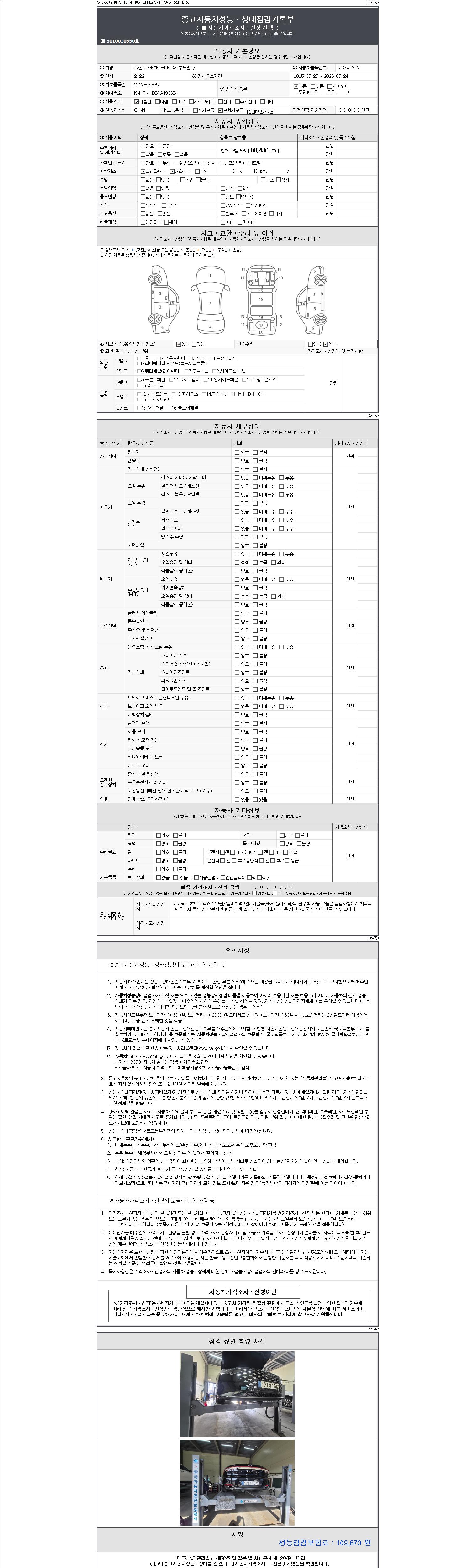 자동차관리법 시행규칙 제120조의 규정에 따라 별지 제 82호서식 《중고자동차 성능, 상태점검 기록부》를 발행한 성능, 상태점검자 및 매매자는 아래의 보증기간 또는 보증거리 이내의 중고자동차, 성능점검 기록부에 기재된 내용과 자동차의 실제 성능, 상태가 다른 경우 계약 또는 관계법령에 따라 매수인에 대하여 책임을 집니다.