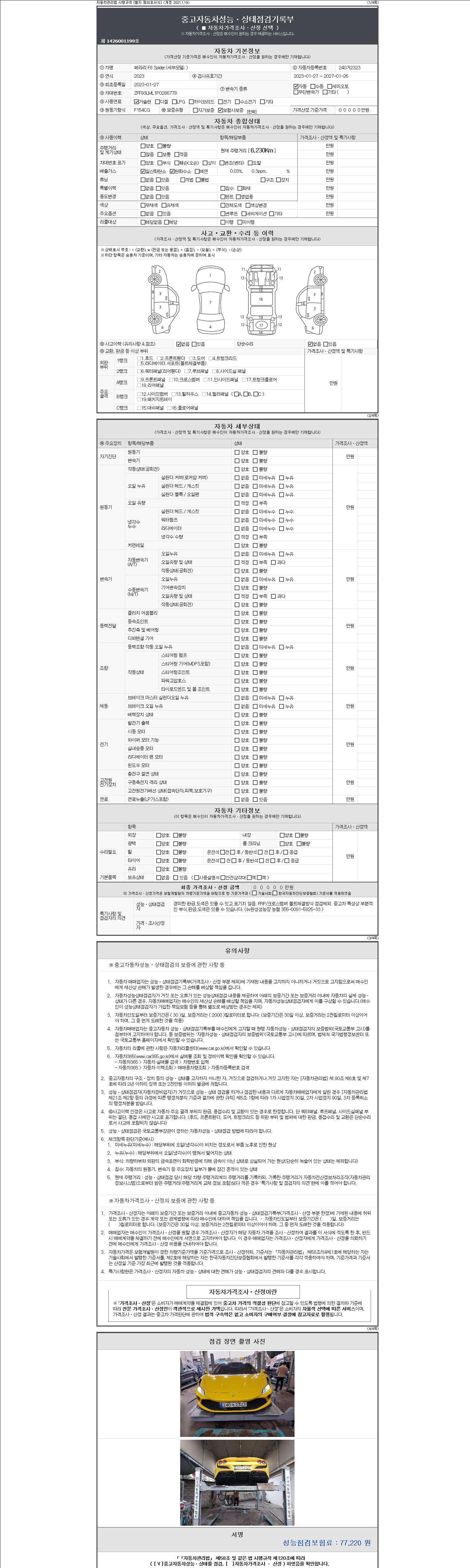 | 주행거리 | 6,230 km | 차량번호 | 240거2323 | 사고유무 | 성능기록부 참조 | 제시번호 | 제 2147483647 호 |