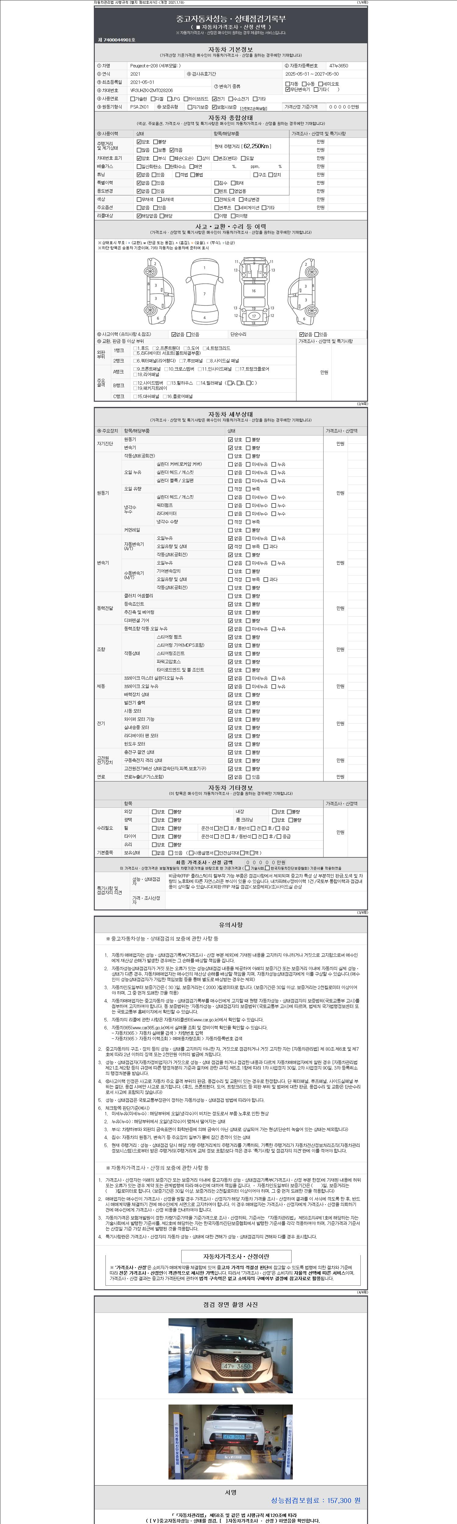 자동차관리법 시행규칙 제120조의 규정에 따라 별지 제 82호서식 《중고자동차 성능, 상태점검 기록부》를 발행한 성능, 상태점검자 및 매매자는 아래의 보증기간 또는 보증거리 이내의 중고자동차, 성능점검 기록부에 기재된 내용과 자동차의 실제 성능, 상태가 다른 경우 계약 또는 관계법령에 따라 매수인에 대하여 책임을 집니다.