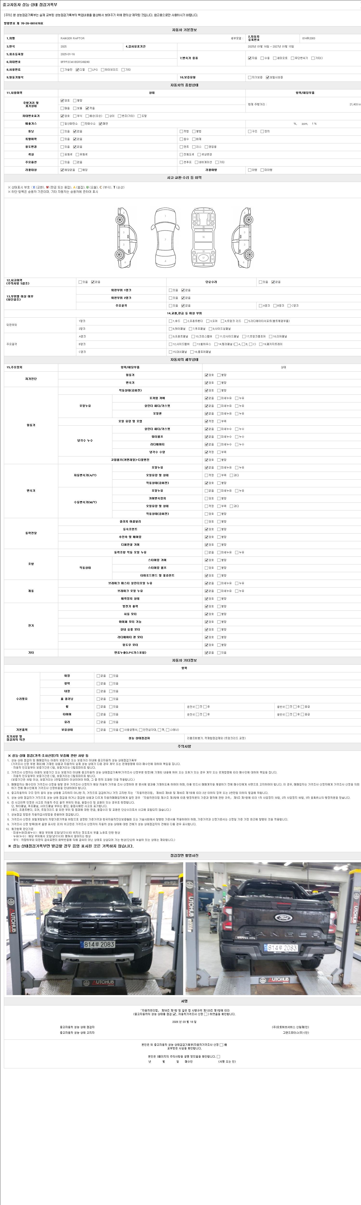 자동차관리법 시행규칙 제120조의 규정에 따라 별지 제 82호서식 《중고자동차 성능, 상태점검 기록부》를 발행한 성능, 상태점검자 및 매매자는 아래의 보증기간 또는 보증거리 이내의 중고자동차, 성능점검 기록부에 기재된 내용과 자동차의 실제 성능, 상태가 다른 경우 계약 또는 관계법령에 따라 매수인에 대하여 책임을 집니다.
