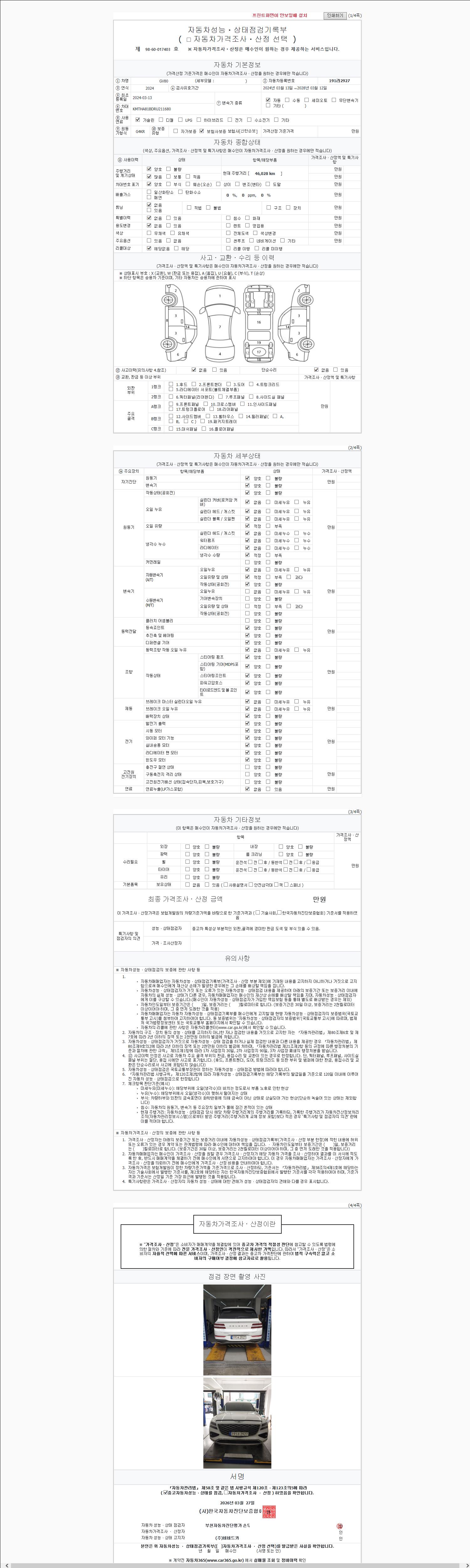 | 주행거리 | 46,024 km | 차량번호 | 191라2927 | 사고유무 | 성능기록부 참조 | 제시번호 | 제 2026056447 호 |